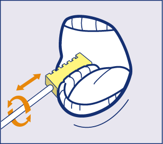 スポンジのフラット面を前後に動かし、舌をみがきます。